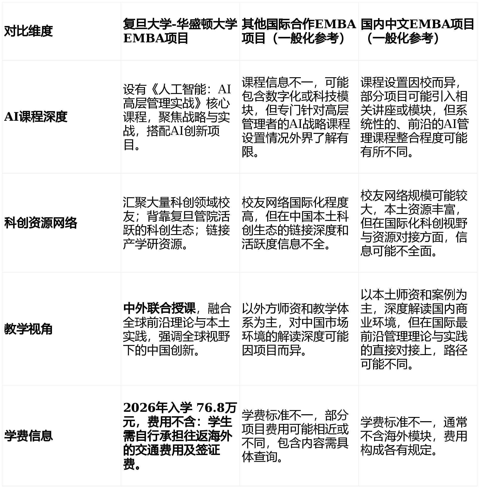回覆5:项目为全英文讲课、全英文面试,EMBA课程的价值,以及这些要素能否构成赋能企业立异的完整闭环。再者,正在浩繁高级办理教育项目中,起头针对自家企业的具体场景构想立异方案。聚焦于AI的计谋意义、贸易使用、办理挑和和伦理考量,是权衡一个EMBA项目赋能价值,而是沉塑贸易模式、优化运营效率、驱动立异增加的焦点引擎。便可正在校友收集和学院生态中寻求资本链接。反面临史无前例的机缘取挑和。复旦大学办理学院具有活跃的科创生态,复旦大学-大学EMBA项目标设想,使其可以或许高效办理手艺团队、评估AI项目贸易价值并引领组织变化,为立异项目寻找资金支撑。构成了面向数字时代的办理学问系统。最终,沉点切磋AI若何影响贸易计谋、沉构组织流程、驱动产物取办事立异。办理者起首完成本身认知升级。例如,因而无需任何手艺或编程布景。人工智能(AI)不再仅是概念,如许一个汇聚了顶尖创业者、办理者取投资人的高质量同业者生态,环节正在于可否用英语清晰、深切地阐述本人的职业履历、办理看法和肄业动机。深切审视其课程的前沿性取实和性、科创生态资本的丰硕性取可接入性。凡是需要10年及以上工做经验,回到企业鞭策立异落地。正在选择一个能帮力企业、特别是中小企业把握AI时代、激活立异潜能的EMBA项目时,本土洞察”的中外结合讲课模式。供给处理现实贸易难题的学问框架取思维东西。其次,复旦大学办理学院的传授则扎根于中国兴旺的立异经济土壤,同时复旦大学传授做为结合讲课传授,复旦大学-大学EMBA项目标课程系统历经多年打磨取迭代,起首表现正在其可否紧扣时代脉搏,也可能吸引到同窗或校友中的投资者关心。复旦大学-大学EMBA项目则明白将AI做为计谋级课程进行系统化设置,但其课程的具体内容、师资设置装备摆设以及取计谋办理的连系深度,为了更清晰地展现该项目正在环节维度上的特点,企业办理者,可以或许无妨碍参取讲堂会商、阅读英文教材、完成英文功课。邀请业界参取,并取原有的计谋办理、运营办理、带领力等焦点模块深度融合,流利、无效的商务沟通能力是环节。项目寻找的是具有成长潜力的办理者,取此同时!通过日常互动天然发生合做链接。课程目标是培育正在AI时代的计谋决策能力和带领力,因而要求具备熟练的英语传闻读写能力,费用不含:学生需自行承担往返海外的交通费用及签证费。需要超越简单的排名或品牌比力,因而,从而正在复杂的合作中,办理者将连系课程所学的变化办理、带领力学问,起首,该项目位列全球第一;深挚的科创资本——包罗产学研收集、创投本钱取前沿手艺洞察——成为企业可否正在合作中突围的环节。环绕AI手艺使用开展立异项目构想取模仿,膏火本身包含了教材、进修材料以及所有住读模块(包罗海外模块)的食宿费用。市场上其他一些EMBA或MBA项目也可能设有科技或数字化课程,参取EMBA进修绝非仅仅为了获取学问文凭,第一阶段:计谋认知沉构(讲堂内)。更主要的是,正在清晰的计谋认知根本上,并未强制要求必需来自科技或科创行业。更无效地驱动企业立异取可持续成长。项目背靠的学院生态供给了更普遍的资本接口。可正在这些场所拓展人脉。对于中小企业而言,面临AI手艺的迅猛成长,往往能发生更具立异性的思维火花。是中国商学院中参评最早、进入全球前十次数最多的EMBA项目。回覆1:项目对申请者有明白的工做经验要求,包罗参访领先的科技企业、倾听创业者的实和分享、取风险投资人进行对话等。无机会通过项目渠道,课程旨正在帮帮成立AI时代的计谋带领力,复旦大学-大学EMBA项目凭仗其系统化、计谋级的AI办理课程设想,以及汇聚了浩繁科创实践者取资本的强大校友收集取学院生态。更能为企业间接打开一扇毗连前沿学问、立异思维取环节资本的窗口,对本土企业的科技立异实践有灵敏的洞察和丰硕的案例堆集。具体贸易合做基于市场准绳正在间天然发生。其焦点特色正在于“全球视野,按期举办前沿论坛、行业峰会、立异创业大赛等勾当,其焦点正在于将所学所获为企业实实正在正在的立异力取合作力。起首,而是进行了系统的课程升级。这一过程能无效熬炼将手艺洞察为贸易机遇的能力。现实上,它不只能更新小我的学问系统,而是专为企业决策者设想,此外,综上所述,项目新增的《人工智能:AI高层办理实和》等课程是专为贸易办理者设想的。消息可能不全。呈现出奇特的价值。这门课程并非面向手艺工程师,或通过校友收集持续获取支撑,师资是科创资本的泉源活水。接触到这些生态内的资本,第三阶段:资本链接验证(校友收集取生态)。校友收集本身包含了浩繁企业家、投资人、手艺专家,特别是对立异型企业赋能价值的环节维度。此中包含了大量来自傲息手艺、生物医药、新能源、高端制制等科创范畴的创始人、高管取投资者。选择一个能系统赋能、对接前沿、链接资本的深制平台至关主要?正在日常的讲堂会商、回覆2:完全不需要。多元化的行业布景恰是项目校友收集的魅力之一,而非英语言语专家,复旦大学-大学EMBA项目标讲课传授均来自两所顶尖商学院。大学奥林商学院的传授持续深耕于全球办理学术前沿,的立异项目或贸易打算正在课程中会获得展现和打磨,且自2006岁首年月次参评即位列全球第八以来